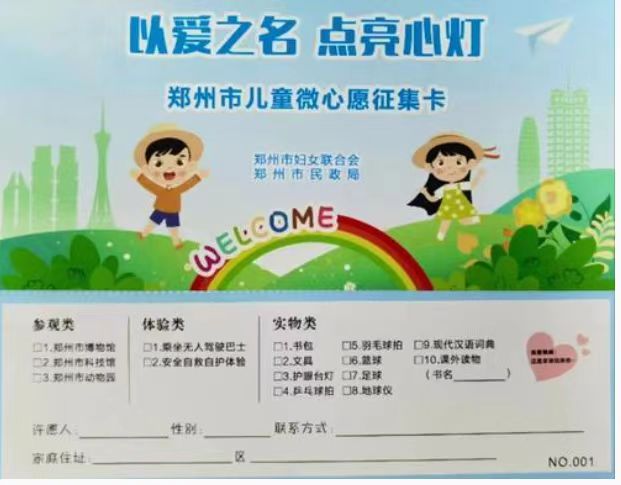在第73个“六一”国际儿童节即将来临之际,为提升全市事实无人抚养儿童的幸福感和获得感,郑州市民政局联合郑州市妇联启动“以爱之名 点亮心灯”儿童微心愿圆梦活动,为郑州市户籍的事实无人抚养儿童提供参观类、体验类和实物类的微心愿清单,按照微心愿征集、微心愿认领、微心愿圆梦的程序,让孩子们进行选择,通过网络发布,链接社会各类资源,广泛动员社会爱心企业和爱心人士为孩子们圆梦。