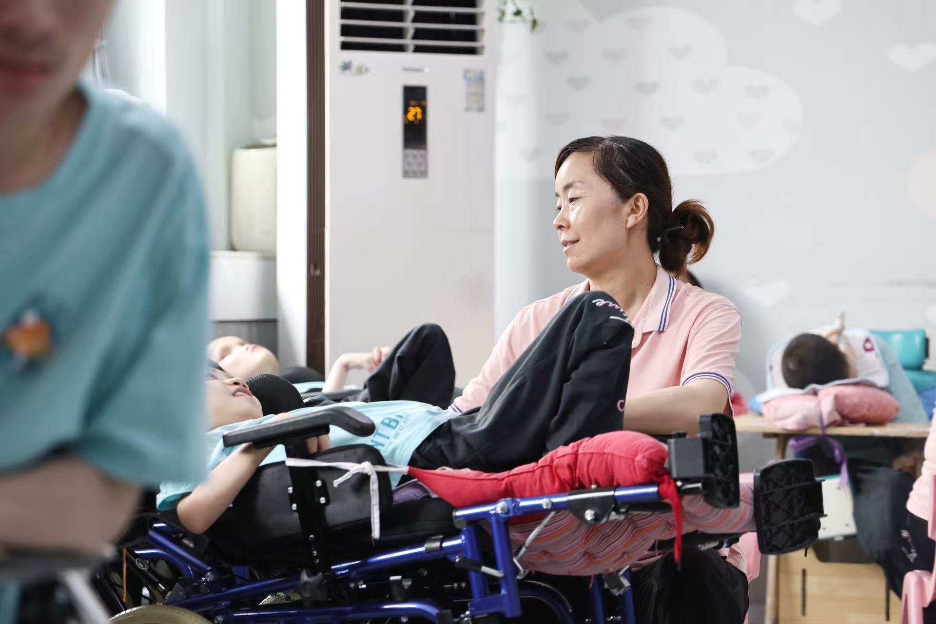 护工在给不能自理的孩子捏腿一家8口组成了特殊家庭