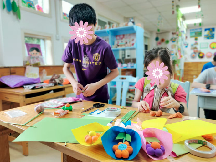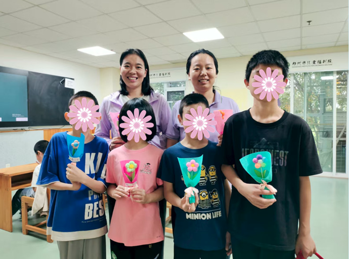 当9月10日的晨光刚漫过郑州市儿童福利院里的特殊教育学校,手工教室就飘起了彩纸的轻响——几个孩子围在课桌旁,小手上沾着粉的、黄的黏土碎屑,连鼻尖都蹭了点金粉,却丝毫不在意,只盯着手里的“作品”专注地捏着、卷着……